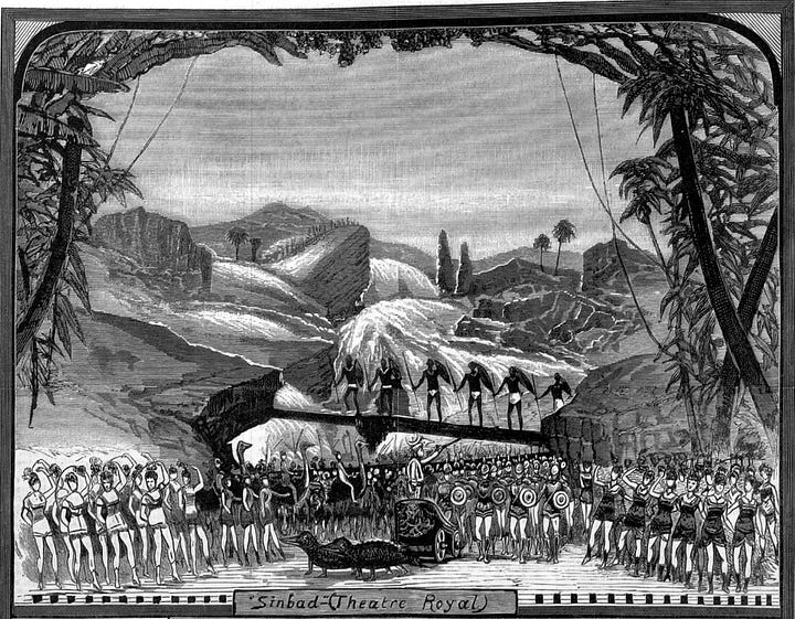 Pantomime scenery wasn’t just beautiful; it was topical. As J. C Williamson was the largest producer of Australian pantomime between 1879 and 1914, his productions showed local scenes as closely aligned with belonging to an Anglo-Saxondom: audiences viewing Williamson’s first pantomime production, Jack and the Beanstalk (1882/83), viewed a “Grand Panorama Of The Egyptian War,” concluding with the bombardment of Alexandria and the landing of British troops. In Ali Baba and the Forty Thieves (1892) audiences saw a staging of “The Triple Alliance and Federation of English Speakers,” featuring a “Grand National Federation Finale” where Britannia, America, and Australia pledged mutual support.